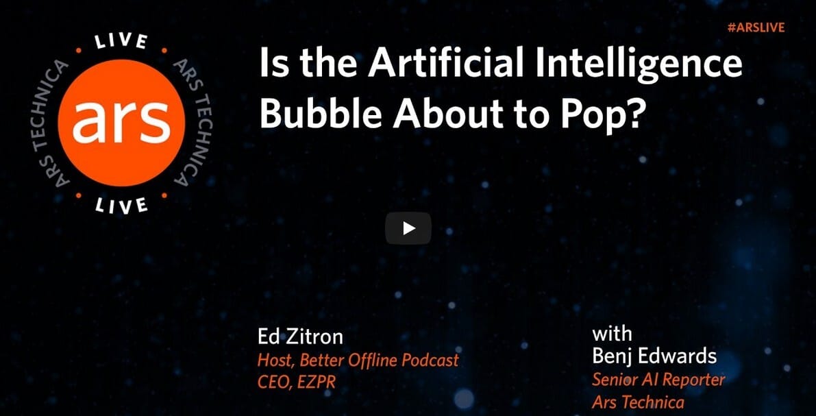 Ars Technica hosted a live conversation with Ed Zitron, host of the Better Offline podcast and one of tech’s most vocal AI critics, to discuss whether the generative AI industry is experiencing a bubble and when it might burst.